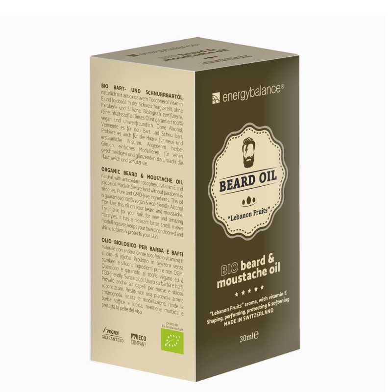 Dieses Bartöl ist biologisch (EU), natürlich und mit der Herstellergarantie Made in Switzerland. Der ausschliessliche Gebrauch der besten biologischen Öle macht “BEARD OIL – Lebanon Fruits” zu einem hochwertigen Produkt, garantiert ohne Parabene und Silikone. Dank seiner Versatilität, genügen wenige Tropfen um einen perfekten Bart und Schnurrbart zu erreichen, sowie geschmeidigere Haare, weiche und geschützte Haut, des Gesichts, der Hände, der Ellbogen und der Knie. Das Produkt wird schnell aufgenommen. Die Auswahl der Inhaltsstoffe der "BEARD OIL - Libanon Fruits" von EnergyBalance macht sie zu einem wertvollen Verbündeten, nicht nur für die Pflege und den Schutz des Bartes, sondern auch für die darunterliegende Haut.