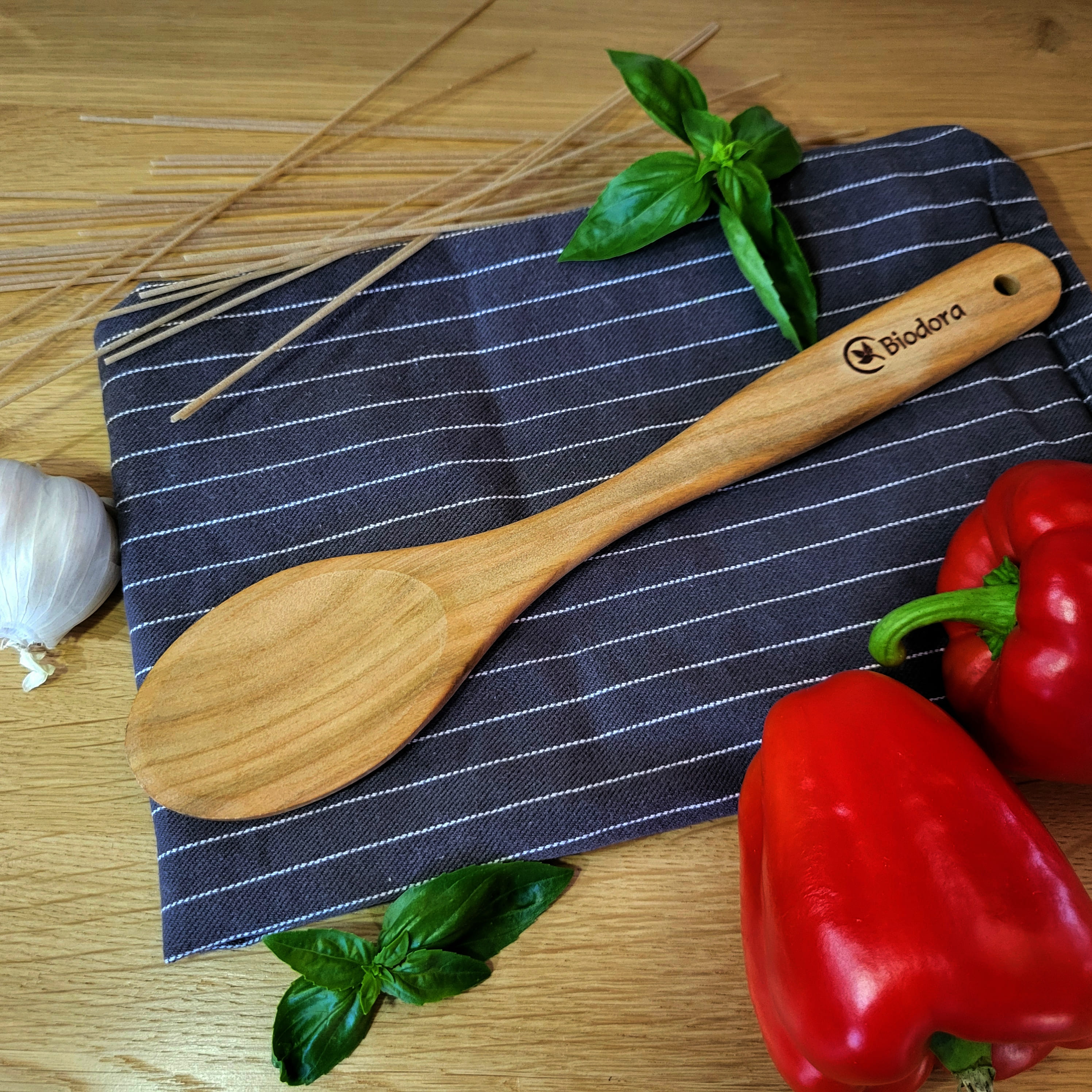 Kirschholz Kochlöffel aus nachhaltiger Forstwirtschaft. Nicht geschirrspülertauglich! Wir empfehlen eine händische Reinigung. Lassen Sie das Produkt nach der Reinigung ablüften und bewahren Sie es trocken auf.