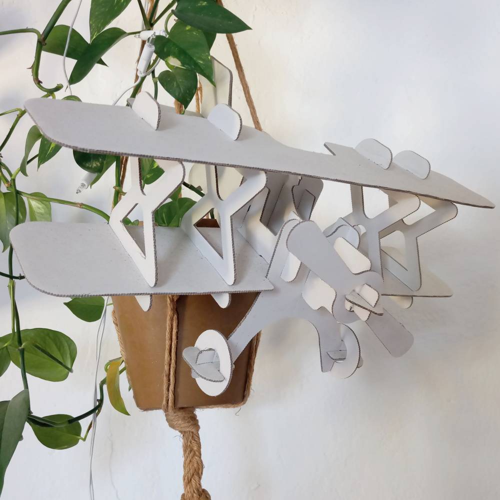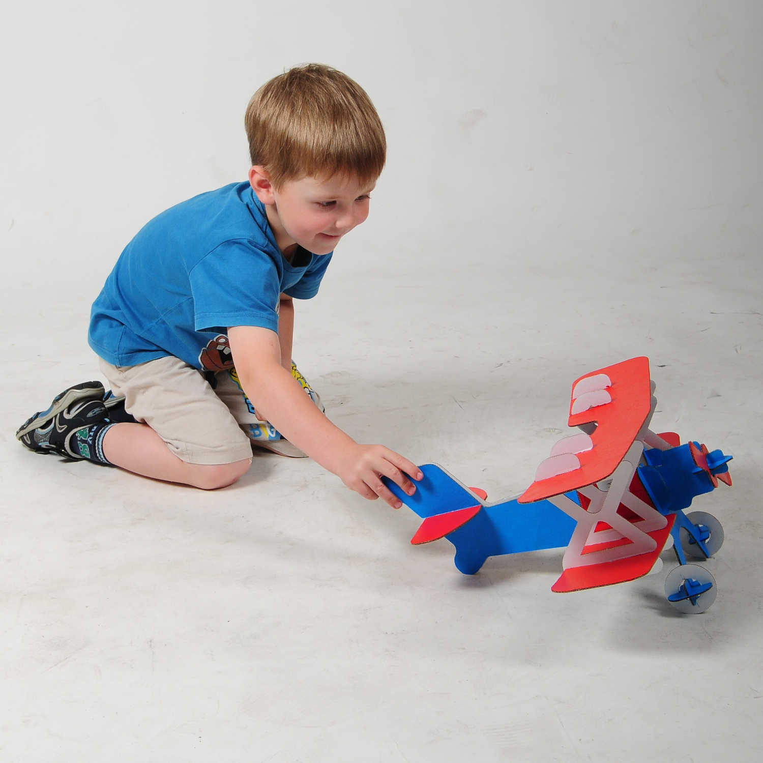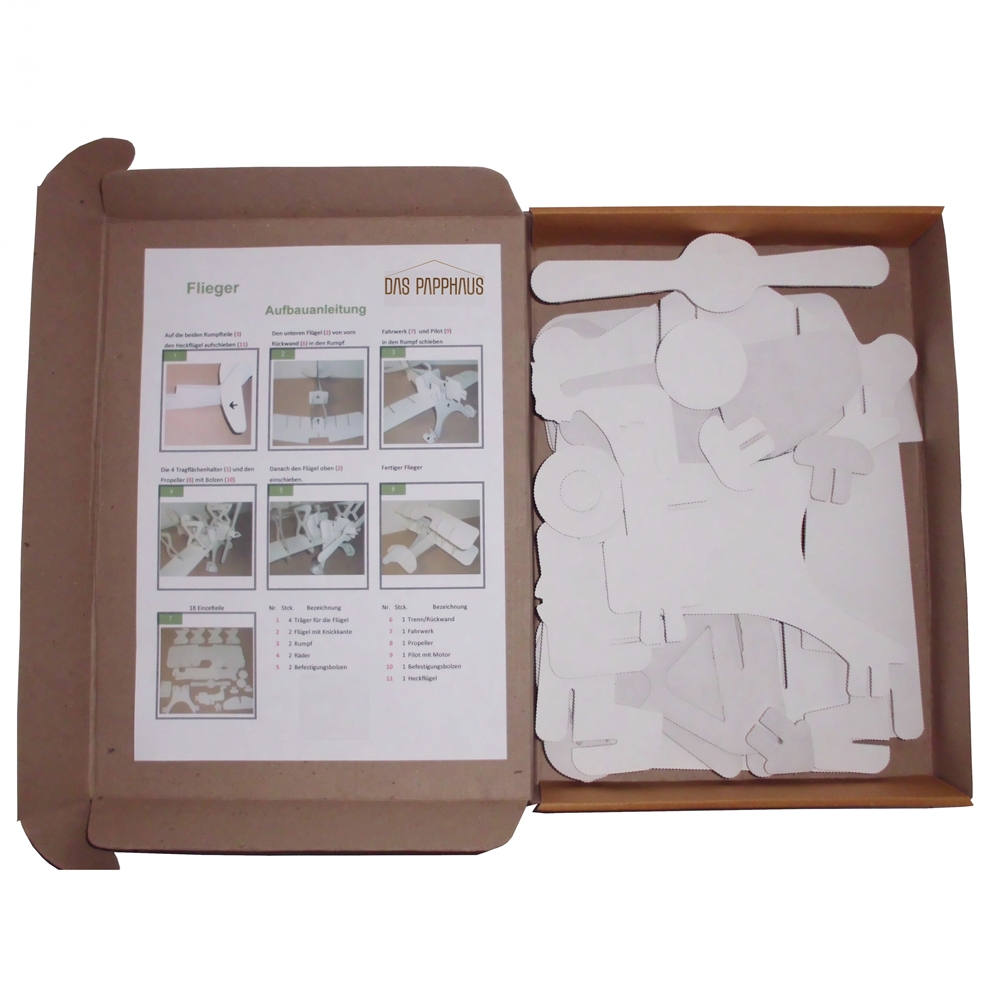 Mit diesem Flieger aus ökologischer und recycelbarer Wellpappe machst du deinem Kind sicherlich eine große Freude! Das Flugzeug besteht aus 18 Einzelteilen, welche schnell und einfach durch ein Stecksystem ein eindrucksvolles Spielzeug ergeben, ganz ohne Klebstoff. Nachdem der Flieger zusammengebaut ist, kann er nach Belieben bemalt und beklebt werden. Der Fantasie der Kinder sind keine Grenzen gesetzt! Jeder Flieger wird somit zum Unikat. Der Traum vom Fliegen zum Greifen nah!