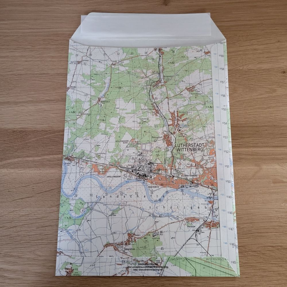 Papierrecycling ist gut, Direktrecycling ist besser! Hergestellt werden die Versandtaschen mit Sichtfenster und Klebestreifen aus nicht mehr aktuellen Landkarten. Das bedeutet Einsparung von Wasser, Binde-und Bleichmitteln zu 100%. Zusätzlich wird bei der Herstellung über 95% Energie gespart. Die Versandtaschen sind ein echter Hingucker und dabei schonend zur Umwelt!