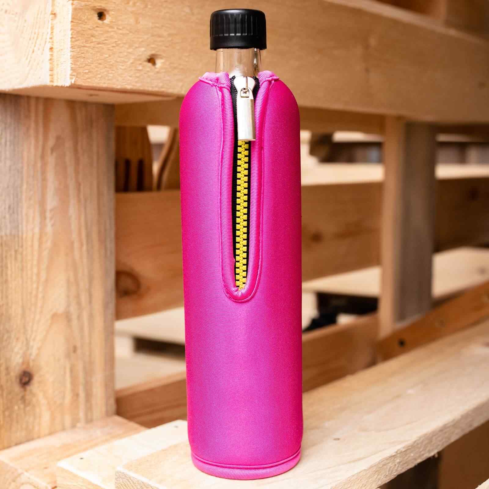 Zu dieser Glasflasche gibt es einen schützenden Neoprenbezug dazu!