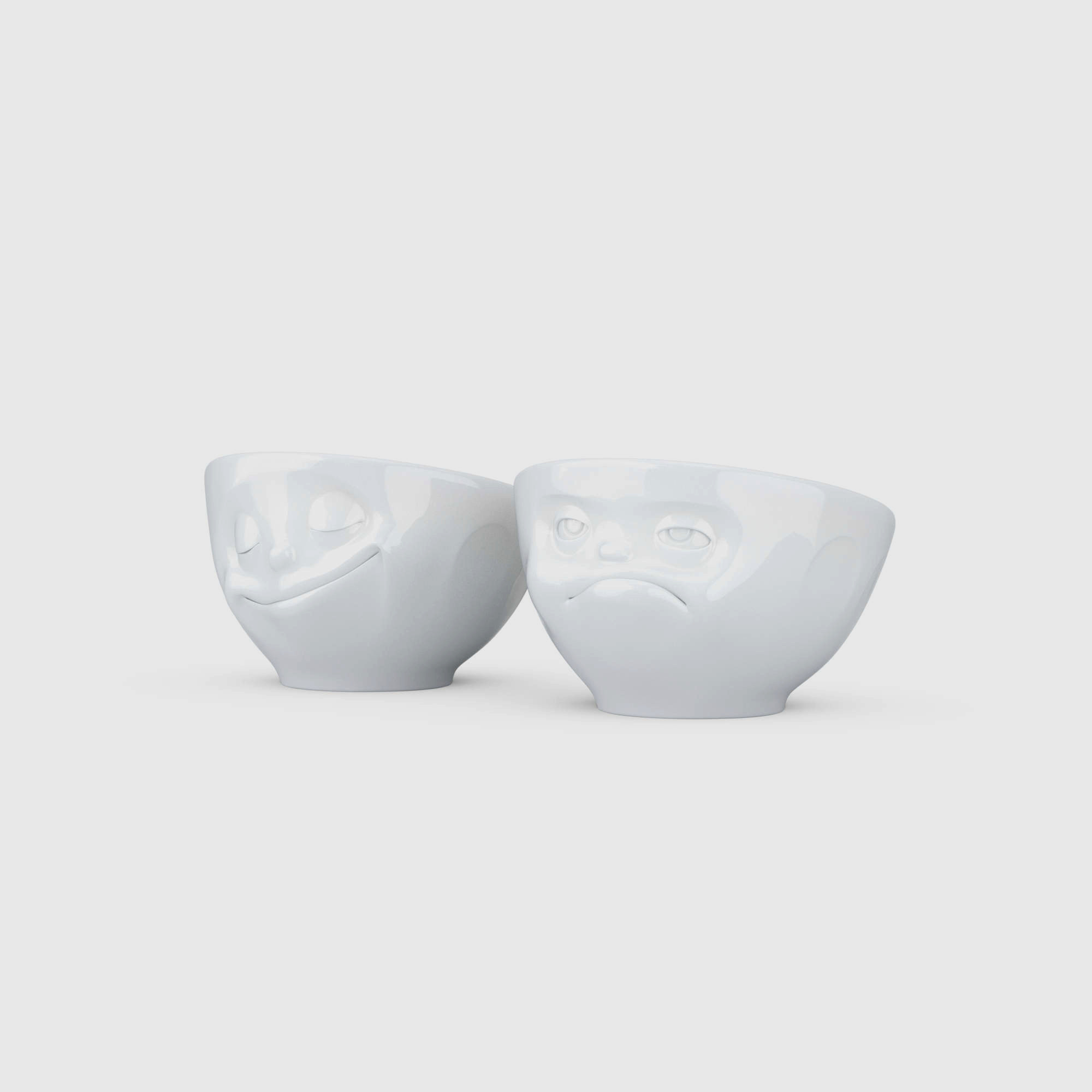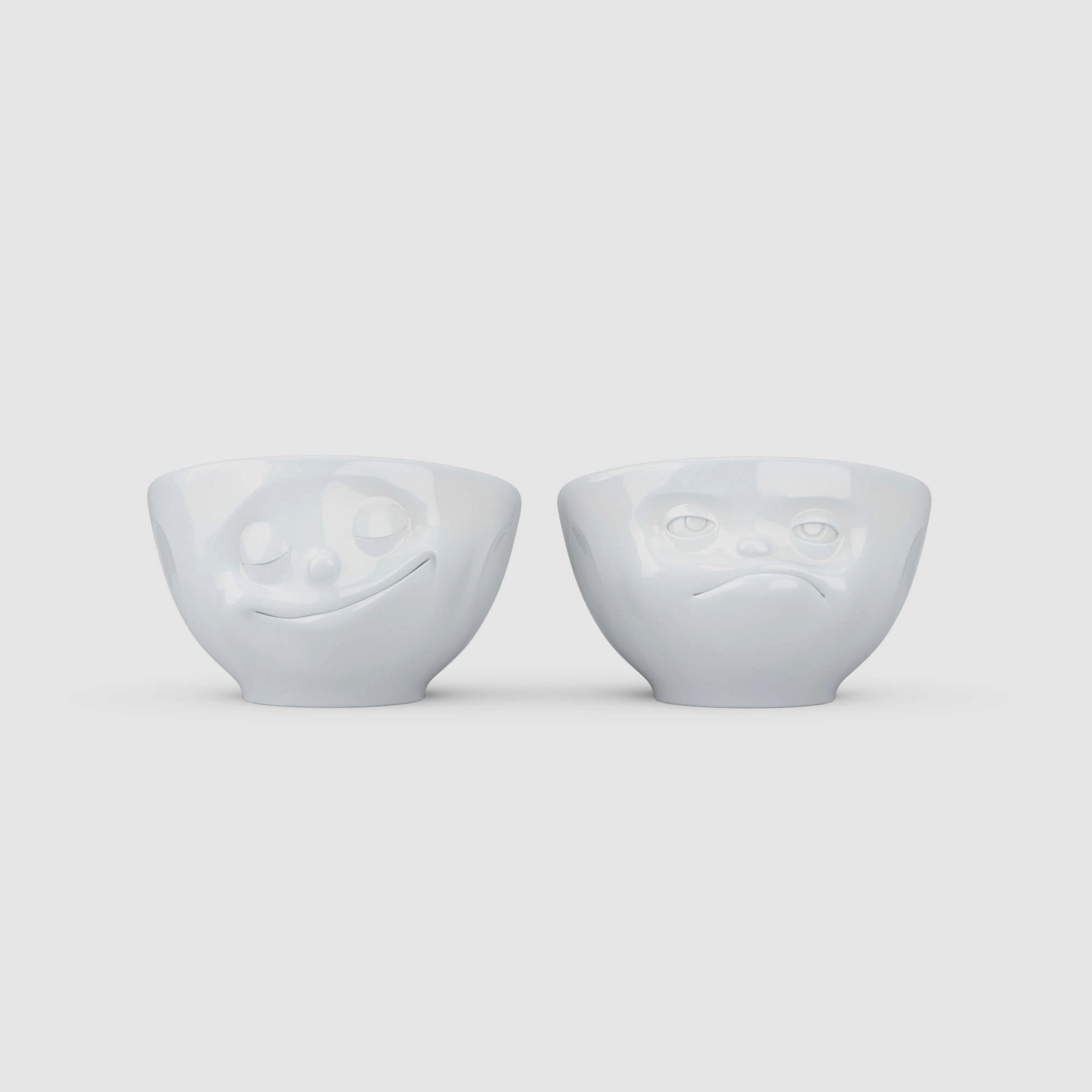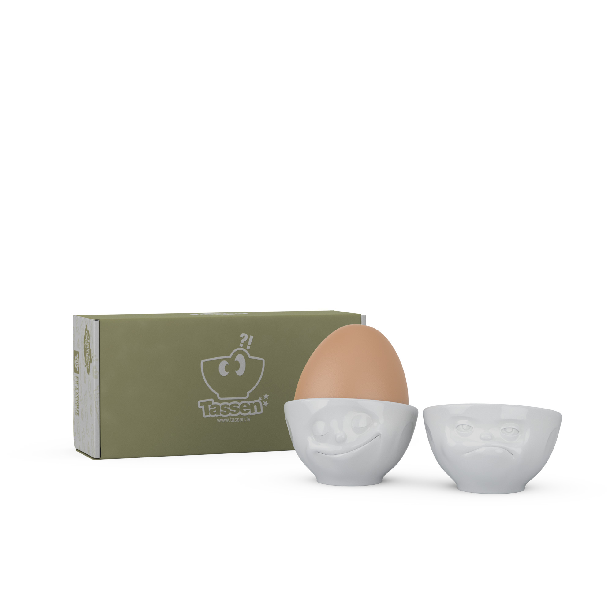 Diese Eierbecher "Glücklich" und "Hmpff" werden jedem ein Schmunzeln auf das Gesicht zaubern.