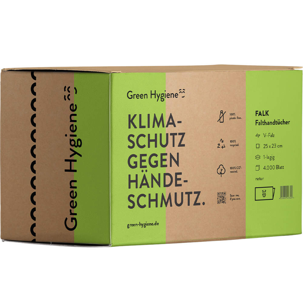 Die Papierhandtücher FALK von Green Hygiene bestehen zu 100% aus recyceltem Papier. Die Papierhandtücher werden CO2-neutralisiert und plastikfrei verpackt!
