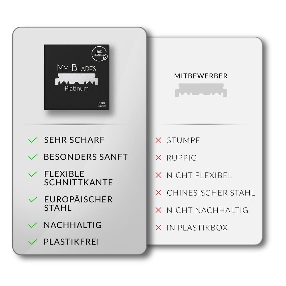 Die Platinumklingen von My-Blades sind nicht nur einfache Klingen, sondern eine Symbiose aus Perfektion und Nachhaltigkeit. In enger Zusammenarbeit mit professionellen Barbieren entwickelt, ermöglichen die platinbeschichteten Klingen ein besonderes Rasiererlebnis. Die Klingen sind kompatibel mit jedem Wechselklingen-Rasiermesser. Die Platinumklingen stehen für mehr als nur die Perfekte Rasur, sondern sind auch ein Statement für höchste Qualität und Nachhaltigkeit. Die Verpackungen der einzelnen Rasierklingen sind mit verschiedenen inspirierenden Zitaten bedruckt und eignen sich daher auch perfekt als Geschenk.