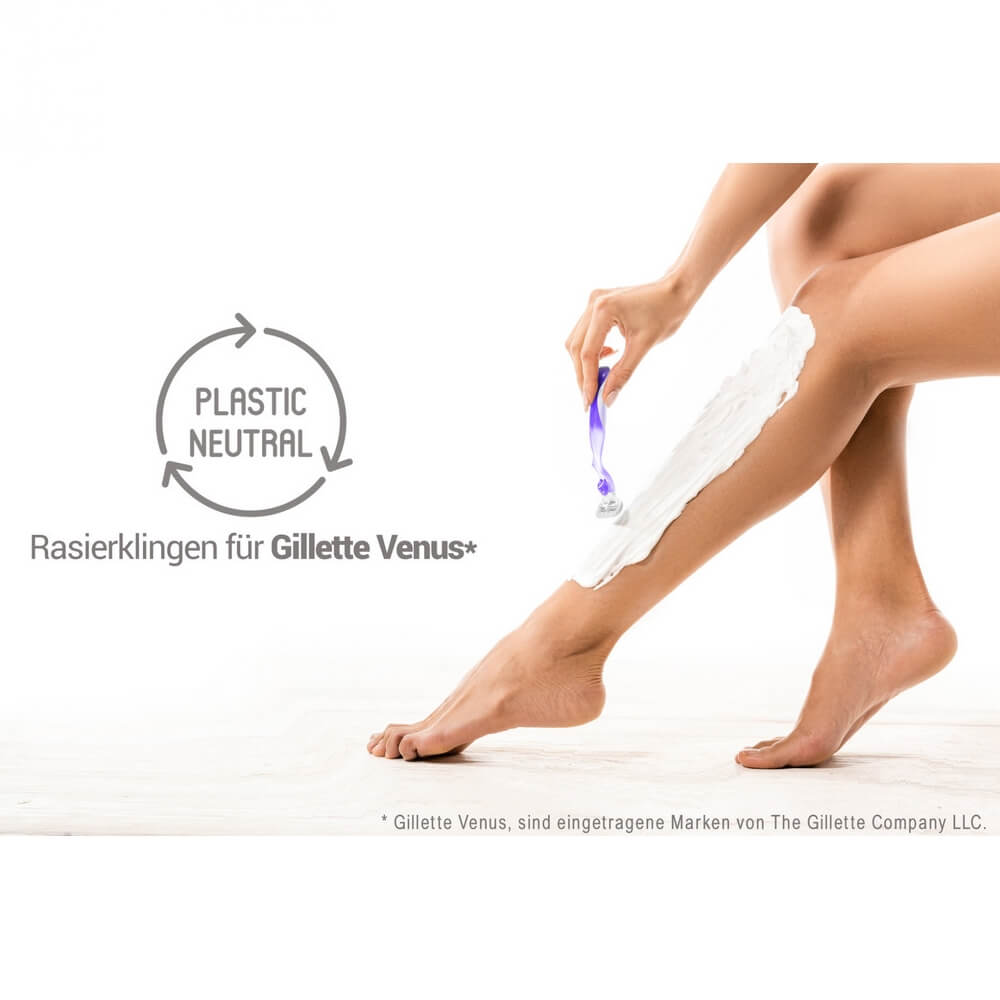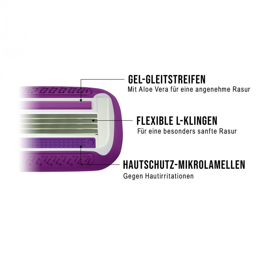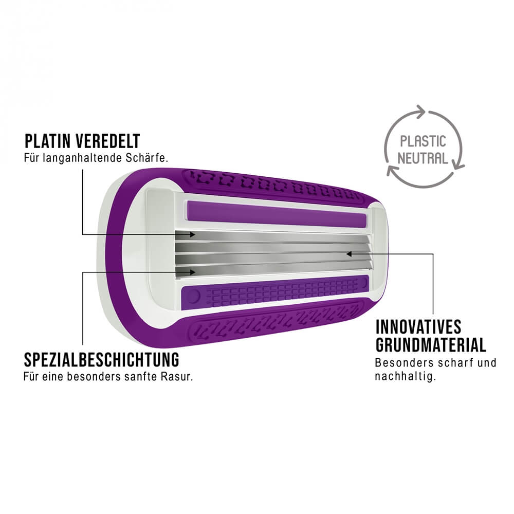 - Die Premium-Edelstahl-Klingen sind mit Platin beschichtet. Dank eines integrierten Gleitstreifens wird eine besonders sanfte und hautschonende Rasur ermöglicht.