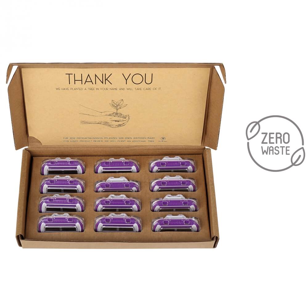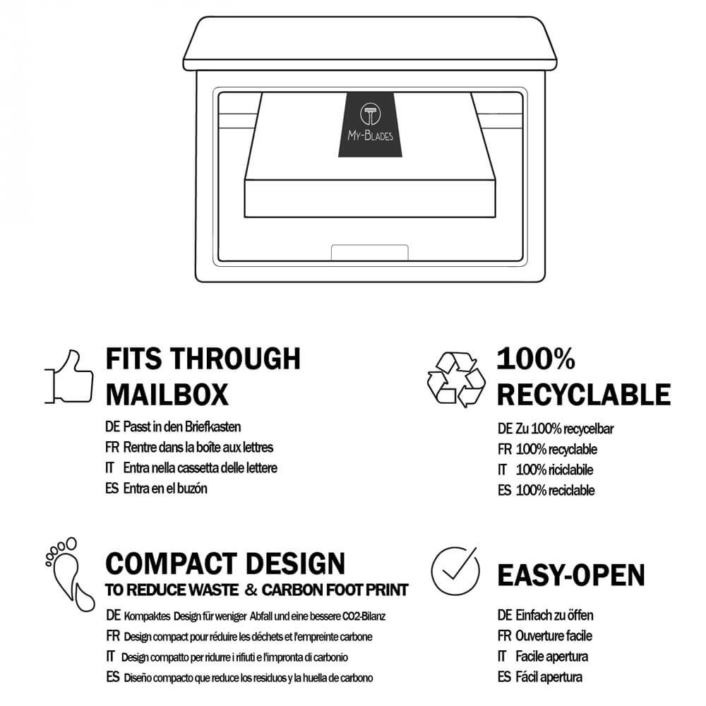 Für jedes verkaufte Rasiermesser pflanzt My-Blades einen Baum. Die Produkte werden plastikfrei verpackt und umweltschonend versendet. Verwendetes Plastik in den Produkten wird kompensiert.