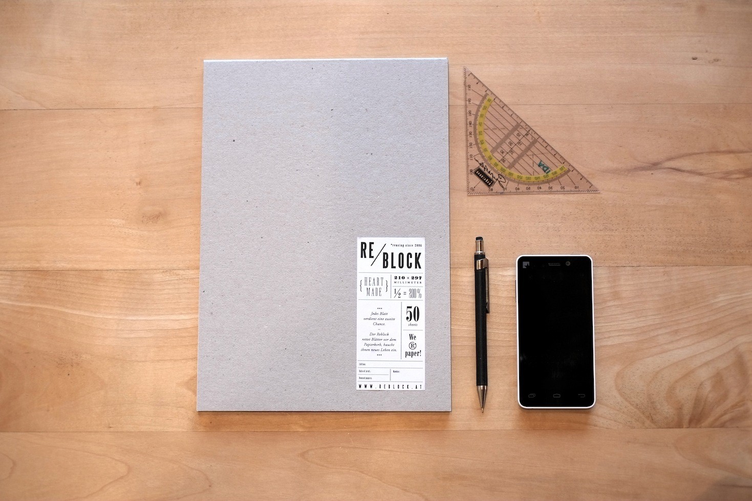 Der Re/block ist erstens ein Notizblock und zweitens ein Reuse-Produkt. Das Besondere daran: Für diesen Notizblock wurde nicht Altpapier mit hohem Energieaufwand wiederverwertet, sondern benutztes Papier (fast) ohne Umwege wiederverwendet. Dazwischen liegen nur das Sammeln und das Binden. Der ReBlock ist innovativ und einfach. Ausgangsmaterial sind einseitig bedruckte Blätter, die nicht (mehr) benötigt wurden und eine zweite unbedruckte also leere Seite haben. Das Endprodukt ist ein faszinierend schönes Designprodukt – der Re/block.
