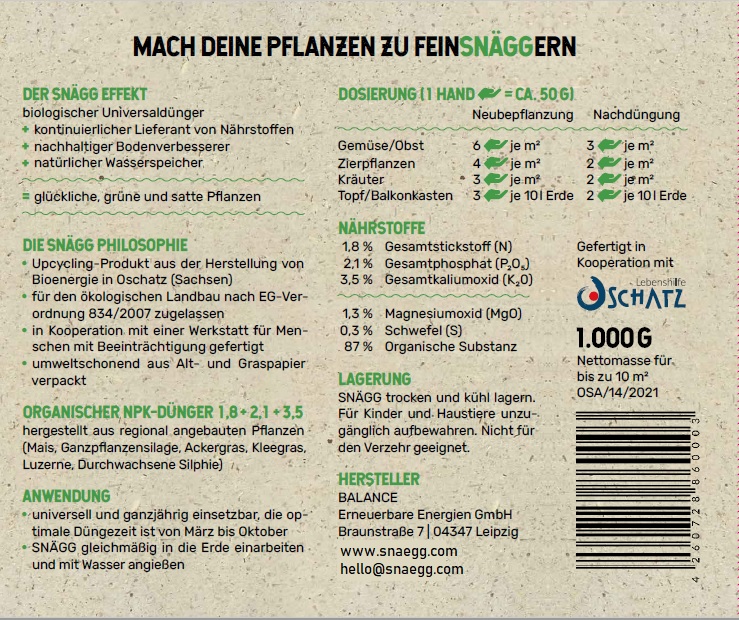 Wir sind die BALANCE Erneuerbare Energien GmbH aus Leipzig und setzen uns neben der nachhaltigen Herstellung von Bioenergie für das ökologische Düngen ein. Mit SNÄGG verfolgen wir das Ziel, allen Pflanzenliebhaber:innen den Zugang zu einem rundum nachhaltigen Produkt zu ermöglichen. Was verstehen wir darunter? Die Bedürfnisse der Pflanze im Einklang mit unserer ökologischen und sozialen Verantwortung bringen: regionale Produktion, nachhaltige Verpackung, faire Bezahlung und soziales Engagement. Gleichzeitig möchten wir mit unserem Produkt für das ökologische Düngen sensibilisieren.