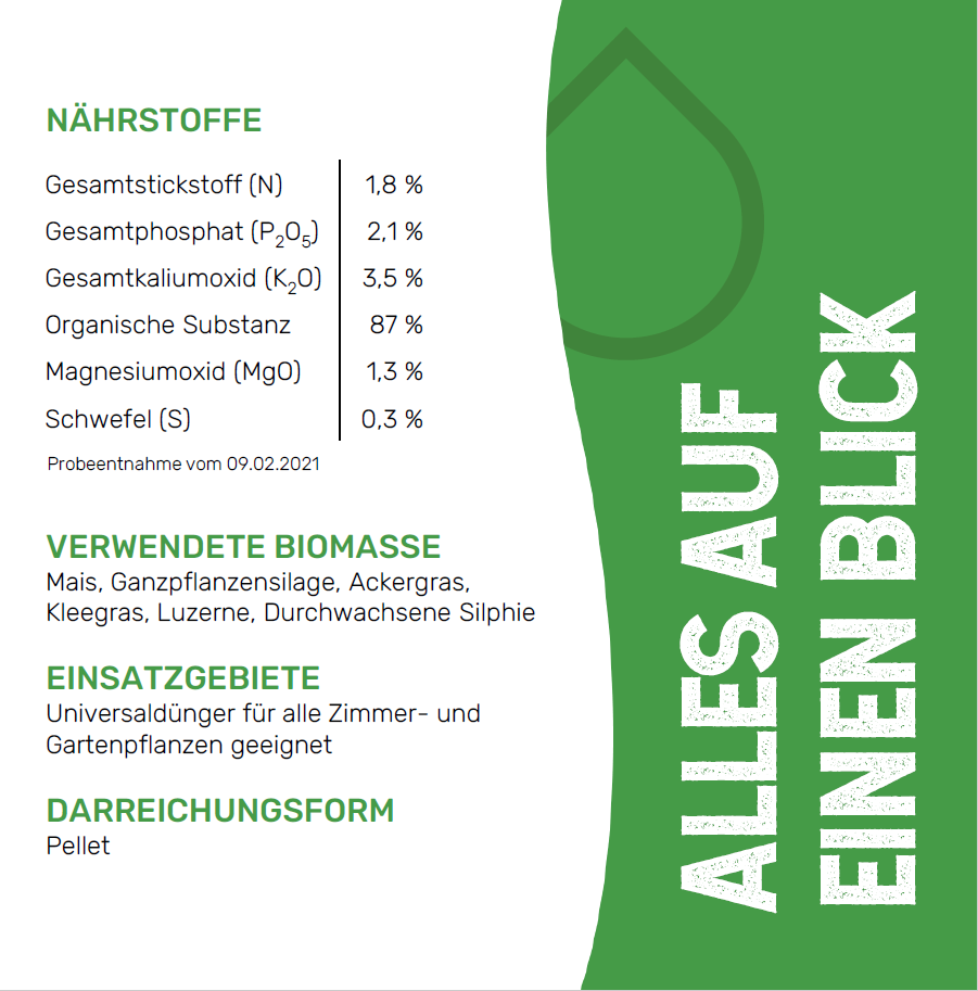 Organischer NPK-Dünger 1,8 - 2,1 - 3,5 ausschließlich unter Verwendung von pflanzlichen Stoffen (Mais, Ganzpflanzensilage, Gras, Luzerne und Silphie) 1,8 % Gesamtstickstoff (N) | 2,1 % Gesamtphosphor (P) | 3,5 % Gesamtkalium (K) | 87 % Organische Substanz | 1,3 % Magnesiumoxid | 0,3 % Schwefel
