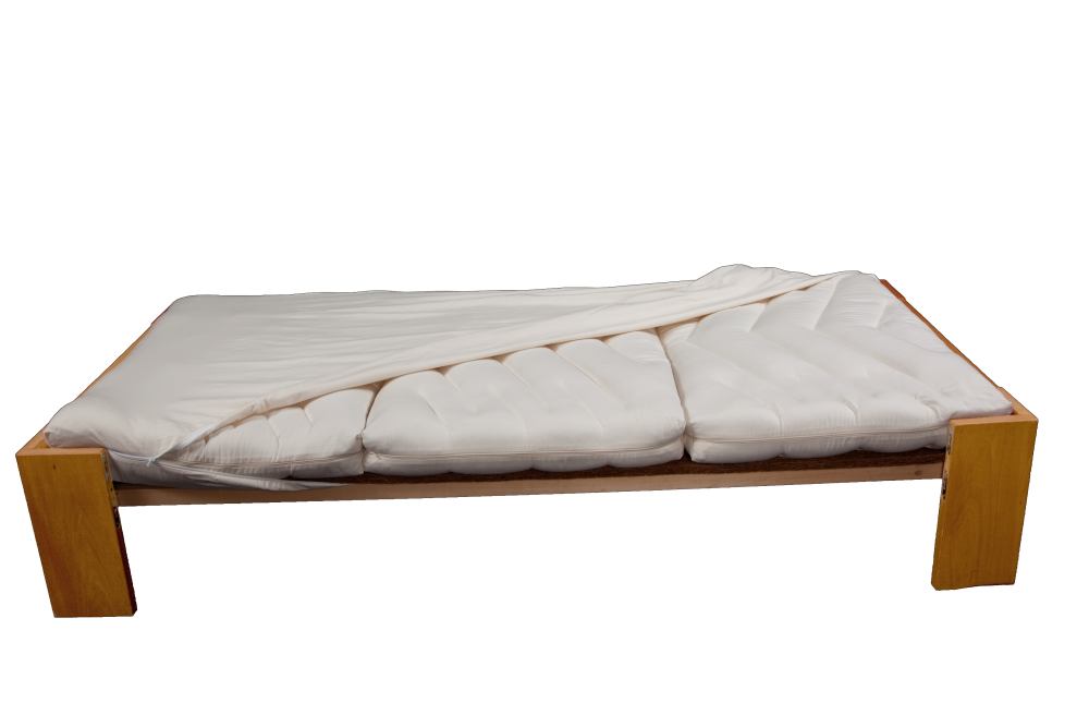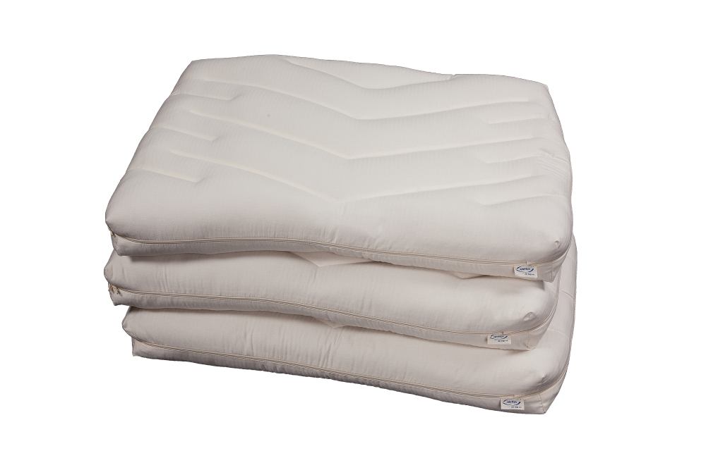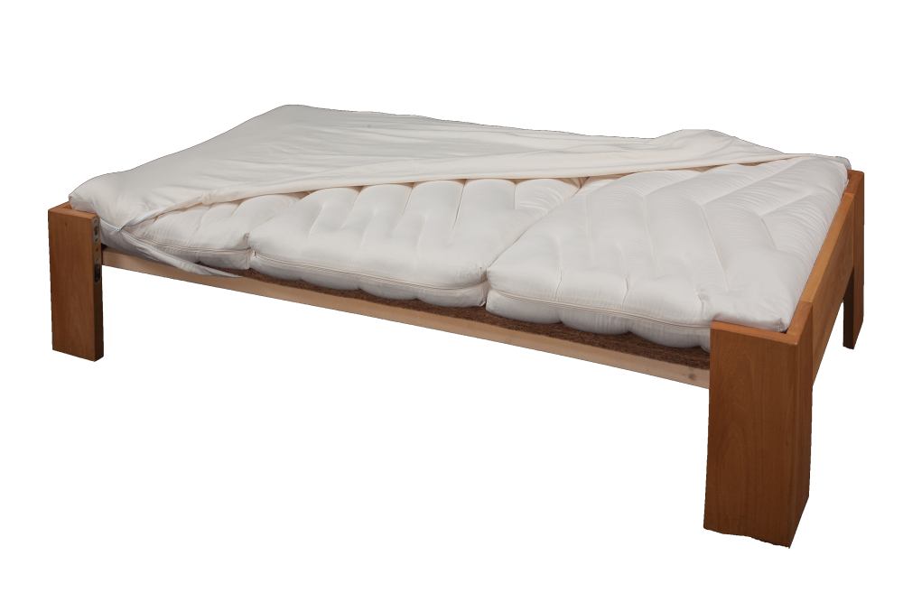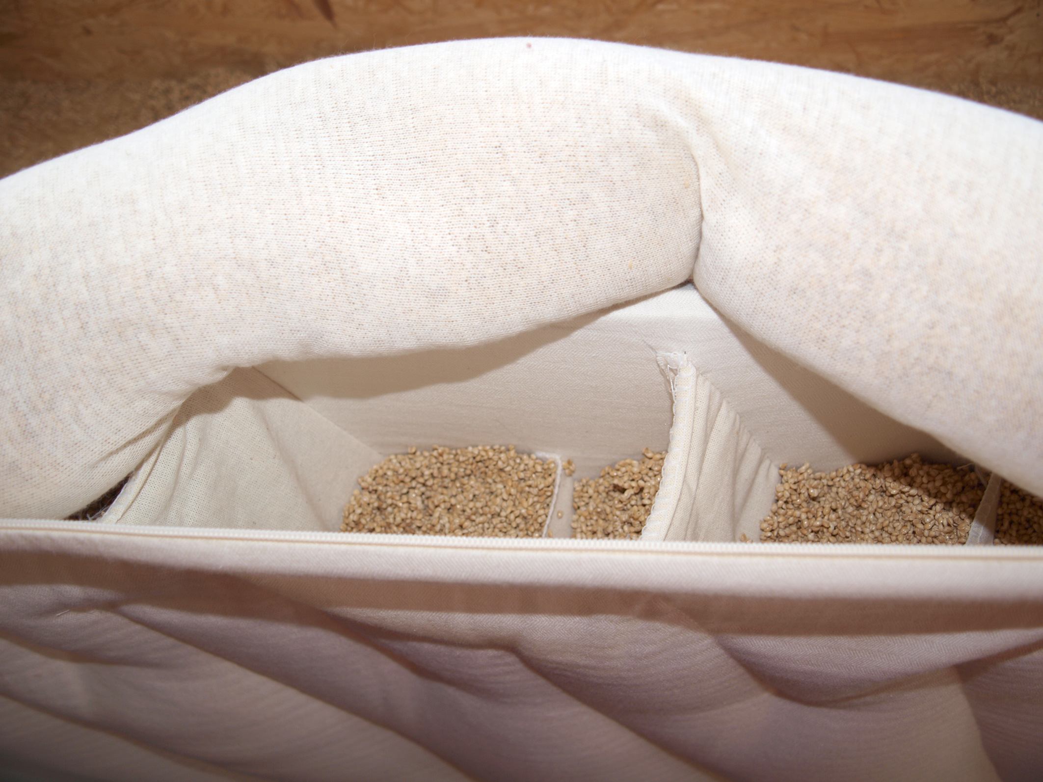 Getreidespelzen-Füllungen gewähren ein Maximum an Luftaustausch. Jeder einzelne Spelz ist für sich ein nachgiebiges, flexibles, kleines Federelement. Besonders handlich sind Matratzenelemente aus denen dreiteilige Matratzen zusammengesetzt werden. Sie fügen sich fast übergangslos aneinander und sind untereinander austauschbar. Wahlweise kann eine passende, abnehmbare Außenhülle verwendet werden, die drei Matratzen-Elemente inkl. der Kokos-Matte umschließt.