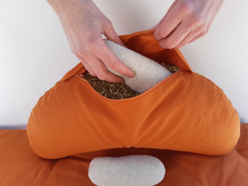 Weil jeder Mensch eine etwas andere Anatomie und Beweglichkeit hat und eine andere Sitzhöhe für sich als optimal empfindet, wollten wir das Kissen so gestalten, dass die Füllmenge ohne großen Aufwand variiert werden kann. Sie kann so für die persönliche Praxis optimal dosiert werden. Für Teilnehmer an Gruppen können leicht Kissen mit unterschiedlichem Füllgrad zu Auswahl gestellt werden.