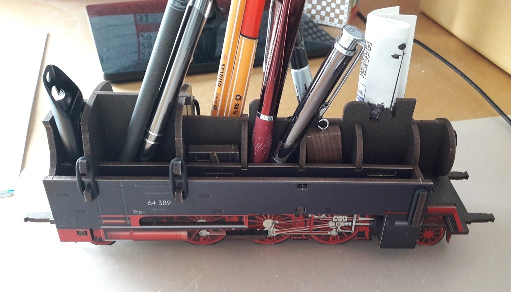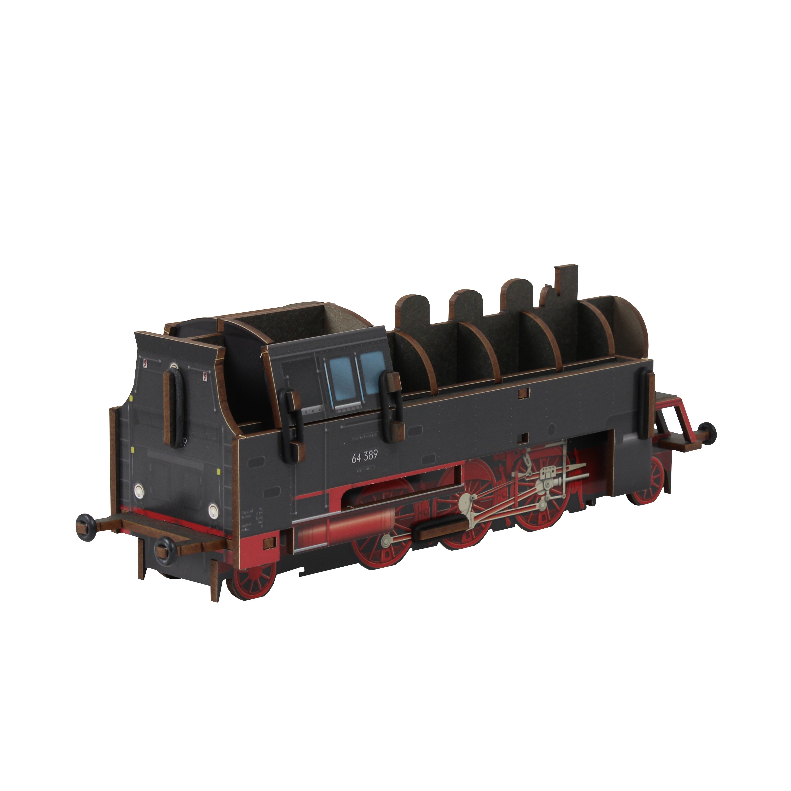Für ein bisschen Reisenostalgie stellen wir uns jetzt die Dampflok BR 64 als Stiftehalter auf den Schreibtisch. Noch bis Mitte der 70er-Jahre brauchte die Einheitslokomotive Passagiere auf den Nebenstrecken von A nach B, heute befördern wir darin unsere Lieblingsstifte.