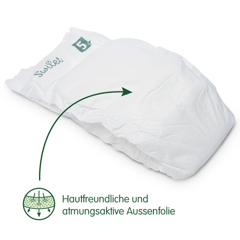 Diese atmungsaktive Windel lässt, dank der aus unbehandelten und nachwachsenden Rohstoffen hergestellten Bio-Aussenfolie Luft in die Windel,- die Babyhaut bekommt Luft zum atmen. Um die Umweltbelastung zu reduzieren, verzichten die Windeln neben Plastik auch auf eine Bedruckung mit Farbstoffen. Bei allen Bestandteilen der Swilet-Biowindel wird auf Nachhaltigkeit und Hautverträglichkeit geachtet. Das Saugkissen besteht aus dem grösstmöglichen Anteil an Zellulose, die zudem aus nachhaltig produziertem Holz hergestellt wird. Die Swilet übertrumpft damit bekanntere Marken von Ökowindeln, die ausnahmslos in weiter Ferne produziert werden (Türkei, Spanien, Tschechien) und tausende Kilometer bis zu uns transportiert werden müssen.