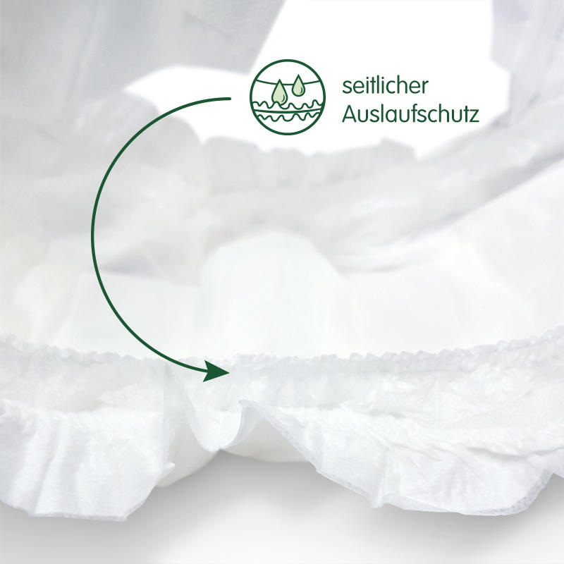 ✓ Passform: anatomisch geformter Saugkern und elastische Beinbündchen, seitlicher Auslaufschutz