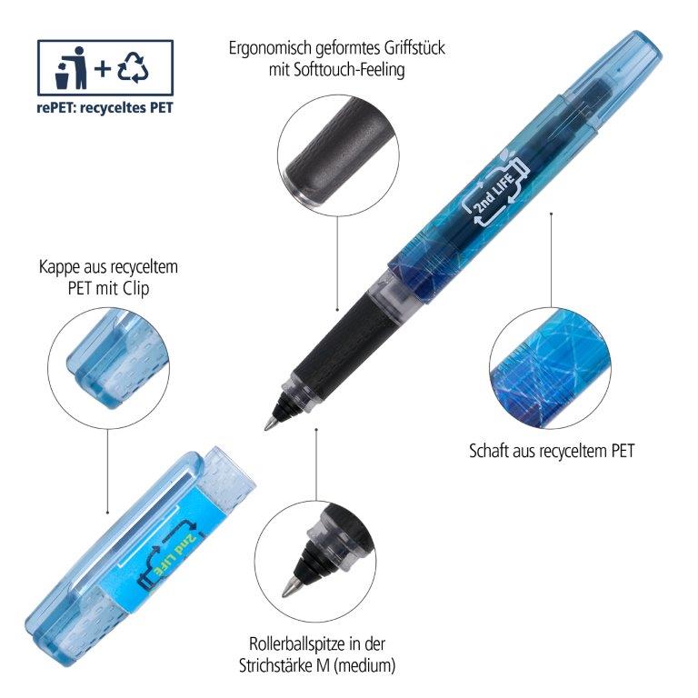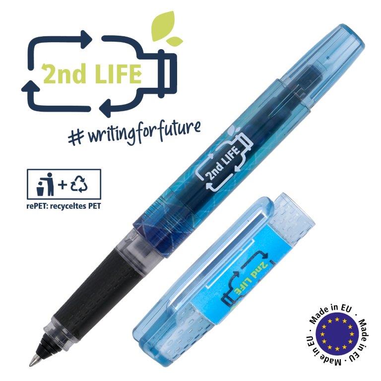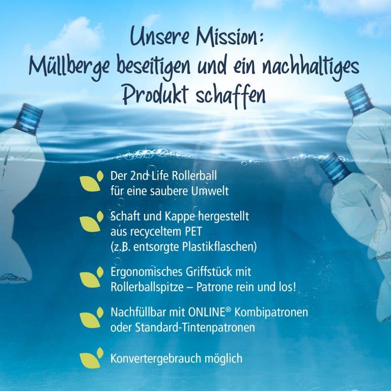 ONLINE Tintenpatronen-Rollerball 2nd LIFE aus recyceltem PET-Kunststoff. Tintenpatronen-Rollerball aus recycelten PET-Einwegflaschen, für Rechts- und Linkshänder, ergonomisches Griffstück, nachfüllbar mit ONLINE-Kombipatronen und Standard-Tintenpatronen Entsorgtem PET-Kunststoff ein zweites Leben schenken und so die Umwelt schützen – mit dem 2nd LIFE PET-Tintenpatronen-Rollerball aus re-PET. Denn das Rohmaterial wird aus dem Recyclingprozess entsorgter PET-Flaschen, Trinkbechern etc. gewonnen. Das bedeutet: Für eine saubere Umwelt – Müllberge vermeiden.